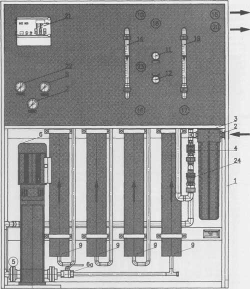Rama stalowa Wlot wody surowej Filtr dokładny (5 mikronów) Wejściowy zawór elektromagnetyczny Czujnik ciśnienia - zabezpieczenie przed pracą "na sucho"*) Pompa wysokiego ciśnienia z silnikiem elektrycznym Zawór regulacyjny Termometr Manometr wysokiego ciśnienia Moduł membranowy Przewód koncentratu*) Zawór spiętrzania koncentratu Zawór odprowadzania koncentratu Przepływomierz koncentratu Przyłącze koncentratu do kanału*) Przewód wody odmineralizowanej pemeatu)*) Sonda pomiarowa przewodności*) Zawór przelewowy wody odmineralizowanej, ok. 2,5 bara* Przepływomierz wody odmineralizowanej (permeatu) Przyłącze wody odmineralizowanej (permeatu) do odbiornika*) Układ sterowania ROE 900 Manometr niskiego ciśnienia Zawór elektromagnetyczny autom.płukania*) Zawór zwrotny (zawracanie) *) Znajduje się na tylnej stronie |