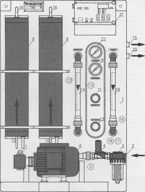 Podstawa Wlot wody surowej Filtr dokładny (5 mikronów) Elektromagnetyczny zawór wlotowy Czujnik ciśnieniowy - zabezpieczenie przed pracą na sucho*) Pompa tłocząca z silnikiem elektrycznym Nadciśnieniowy zawór bezpieczeństwa Manometr wysokociśnieniowy Moduł membranowy Przewód wody odmineralizowanej Zawór spiętrzania koncentratu Zawór powrotny koncentratu Zawór zwrotny*) Przepływomierz koncentratu Podłączenie koncentratu do kanału Przewód koncentratu Sonda pomiarowa przewodności*) Zawór przelewowy wody odmineralizowanej, ok. 2,5 barów*) Przepływomierz wody odmineralizowanej Przyłącze wody odmineralizowanej do odbiornika Układ sterowania ROE 200 (900) Manometr niskiociśnieniowy Zawór elektromagnetyczny automatu płukania*) *) Znajduje się na tylnej stronie |